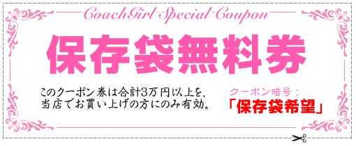 こちらクーポンは当店で3万円以上の商品を一度でお買い物をしていただいたお客様限定のクーポン券です。コーチの純正保存袋を1枚無料でプレゼントさせて頂きます!お買い物の際、カート内の備考欄に「保存袋希望」と記入してください。(記入が無いと無効ですので要注意!)入手困難なコーチの保存袋を是非お得にゲットしてくださいね!※他のクーポンとの併用は出来ません。※在庫に数に限りがございますので無くなり次第終了となります。 |