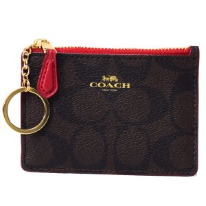 【COACH】コーチ コーティングキャンパス シグネチャー キーリング付 スキニー コインケース ブラウン×ルビー(日本未発売)