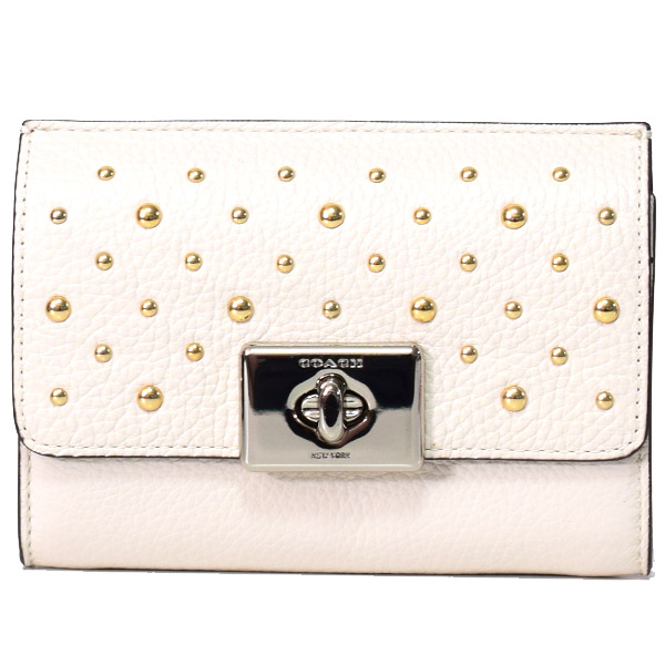 コーチからとっても可愛い二つ折り財布です♪清潔感溢れるホワイト系カラーのベブルド本革レザーに無数のスタッズで上品に仕上がった日本未発売のお財布です♪フロントのシルバーのターンロックもアクセントになったシンプルで使いやすい仕様が大好評で、一つは持っておきたいコンパクト財布!ポケットも豊富で、機能性まで拘った万能アイテムです!収納スペースも多く、小銭入れ、札入れ、カード入れなど機能性も充実しており使い勝手も抜群◎プレゼントにもおすすめです♪本日16時までの注文は即日出荷!もちろん全品送料無料!お客様の顔を思い浮かべ真心込めて梱包いたします!アメリカのコーチファクトリーより入荷の新品本物の商品ですのでどうぞご安心してお買い求めくださいませ。
