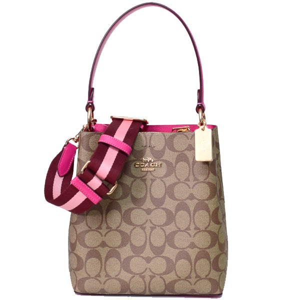コーチのとっても上品なバケツ型2WAYバッグ!シグネチャー柄をベースに随所にピンク色レザーがアクセントになったシンプルなデザインは様々なシーンで活躍できそう♪内側はマグネット式とファスナー式の間口で仕切られた使い勝手の良い仕様が大人気*付属ショルダーストラップは取り外し可能で、シーンやスタイルに応じて2WAYでお使い頂けます♪ご自分用にももちろん、大切な方へのギフトにもおすすめのアイテムです!本日16時までの注文は即日出荷!もちろん全品送料無料!お客様の顔を思い浮かべ真心込めて梱包いたします!アメリカのCOACHファクトリーより入荷の新品本物の商品ですのでどうぞご安心してお買い求めくださいませ。