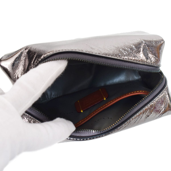 コーチの可愛いコスメポーチを本場アメリカで直入荷!コーチ良質メタリック系レザーがとってもキュートなコスメポーチ♪中でも珍しい全面シルバー系の新色のアンスラサイトは超入手困難!オールレザーでシンプルなデザインにフロントにはブランドロゴが添えられ高級感も演出◎使い勝手の良い大きめサイズはメイク道具はもちろん、小物なども収納可能なのも嬉しい*プレゼントにもオススメ!本日16時までの注文は即日出荷!もちろん全品送料無料!お客様の顔を思い浮かべ真心込めて梱包いたします!アメリカのコーチファクトリーより入荷の新品本物の商品ですのでどうぞご安心してお買い求めくださいませ。