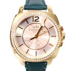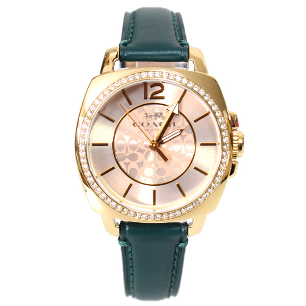 コーチのとても綺麗なゴールドの腕時計♪グリーンの本革ベルトが超キュート♪ベゼルにラインストーンが埋め込まれたオシャレ際立つ日本未発売モデル!四角と丸を融合させたケースがアクセント♪文字盤にはコーチのシグネチャーが描かれた上品なデザインがGOOD♪飽きのこないシンプルな時計なので様々なコーデにも合わせやすそう!大切な方へのギフトにも最適!自分へのご褒美に如何ですか。嬉しいコーチ純正ボックス付きです♪本日16時までの注文は即日出荷!もちろん全品送料無料!お客様の顔を思い浮かべ真心込めて梱包いたします!アメリカのCOACHファクトリーより入荷の新品本物の商品ですのでどうぞご安心してお買い求めくださいませ。※新品のためガラスを含め随所に保護用フィルムが貼られている場合がございます。
