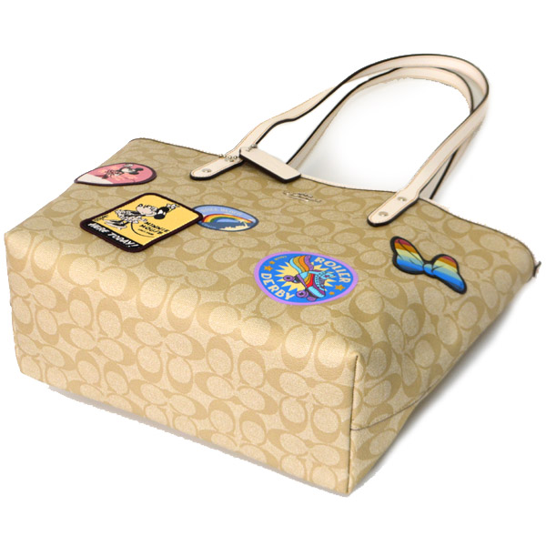コチガルのホームトートバッグ【COACH】コーチ ディズニー ミニーマウス コラボ シグネチャー パッチワーク トート ショルダーバッグ ライトカーキ×チャーク(日本未発売)