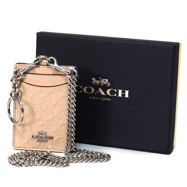 コチガルのホームカードケース【COACH】コーチ エンボスパテントレザー シグネチャー ラメ チェーン キーリング付き BOX付き ID ランヤード 首かけ カードケース プラチナム(日本未発売)