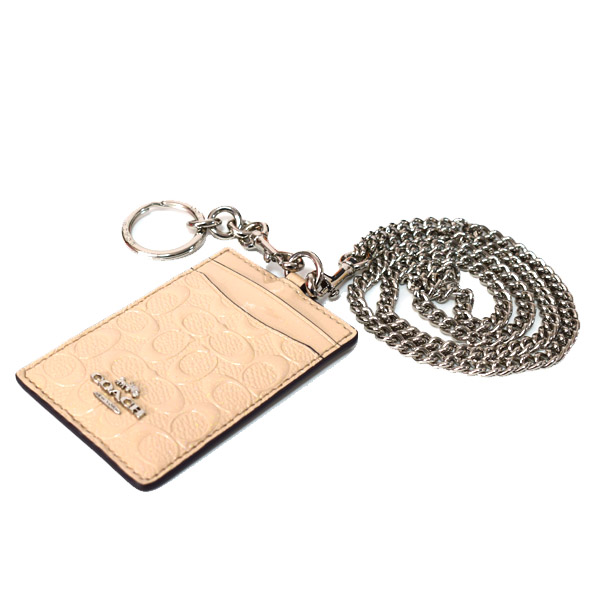 【COACH】コーチ エンボスパテントレザー シグネチャー ラメ チェーン キーリング付き BOX付き ID ランヤード 首かけ カードケース プラチナム(日本未発売)[38658]