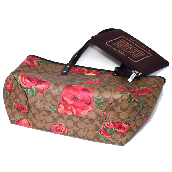 コーチから大きなバラが大胆に描かれたシグネチャー柄の日本未発売トートバッグを本場アメリカで直入荷!オックスブラッド一色でシンプルにデザインされた裏側と両面リバーシブルで使える一石二鳥トートバッグ♪ゴールドの金具とロゴの馬車マークで一層高級感あふれるデザイン仕上がっております!アメリカ限定の大きめトートなのでA4ファイルも軽々収納でき、マチも広く荷物の多い方に特におすすめです!様々なシーンで大活躍しそう♪本日16時までの注文は即日出荷!もちろん全品送料無料!お客様の顔を思い浮かべ真心込めて梱包いたします!アメリカのCOACHファクトリーより入荷の新品本物の商品ですのでどうぞご安心してお買い求めくださいませ。